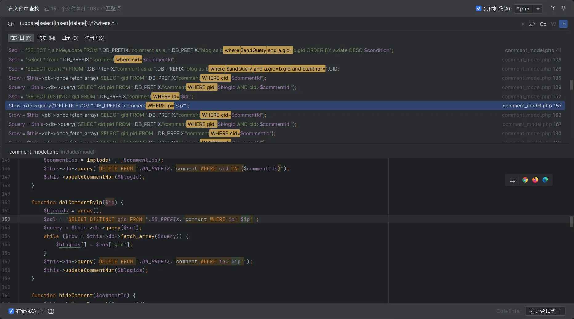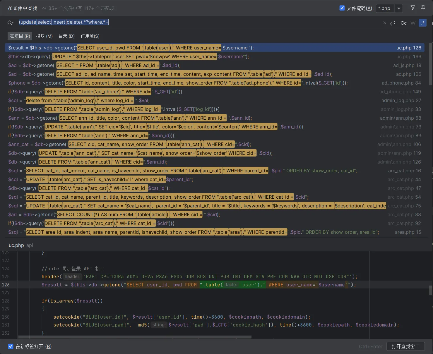 + 正则搜索:PHPStrom正则语句:(update|select|insert|delete|).*?where.*= + 功能追踪:查询功能点所对应的文件中是否存在注入 + 语句监控:利用数据库监控工具监控每个功能执行的语句来判断是否存在SQL注入案例一: