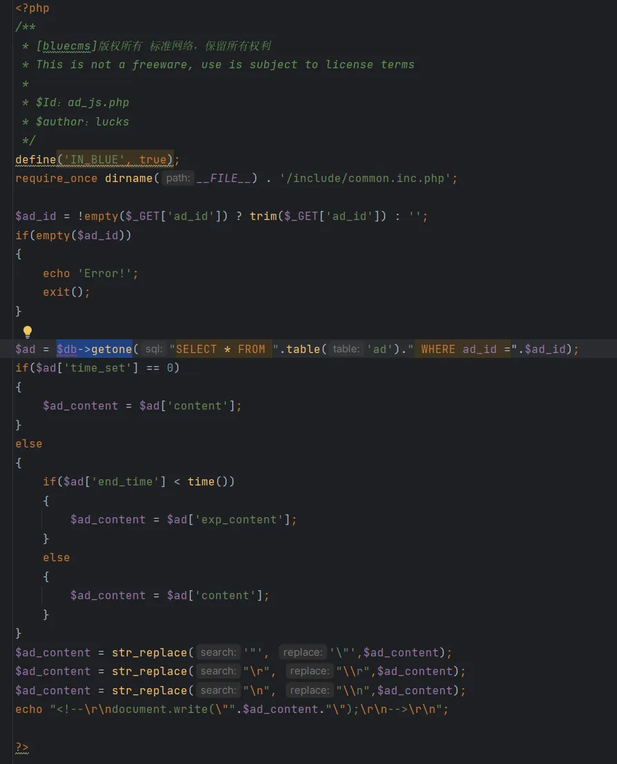 这里的$ad_id是由GET方法传入的参数,参数可控,上文只对其进行了是否为空的检查,检查不严格,同时$db->getone对语句进行了执行,存在漏洞的三要素满足所以此处应该存在sql注入