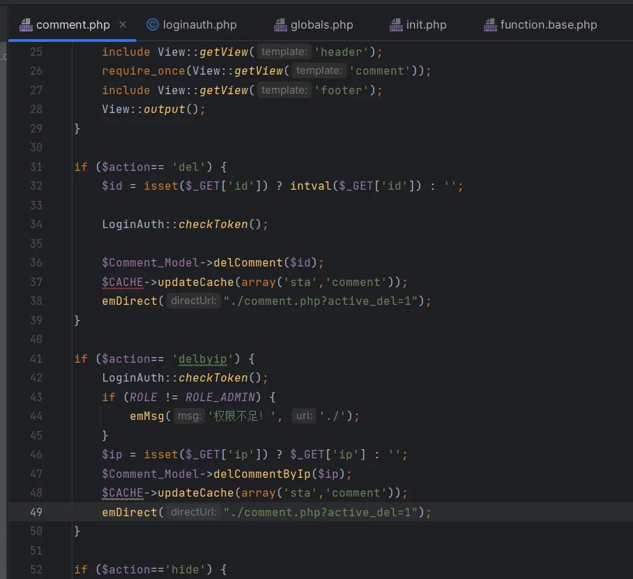 第一个要满足的条件是$action== ‘delbyip’,这里的action来自admin/globals.php,是由$_GET[‘action’]传入
