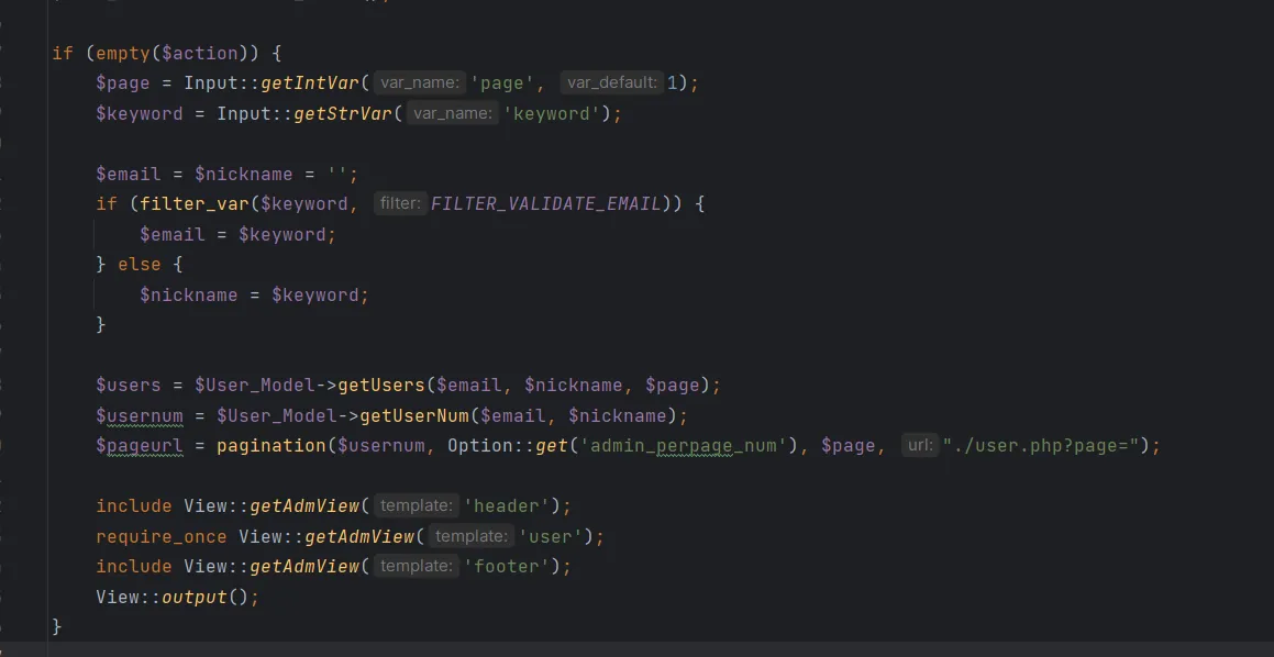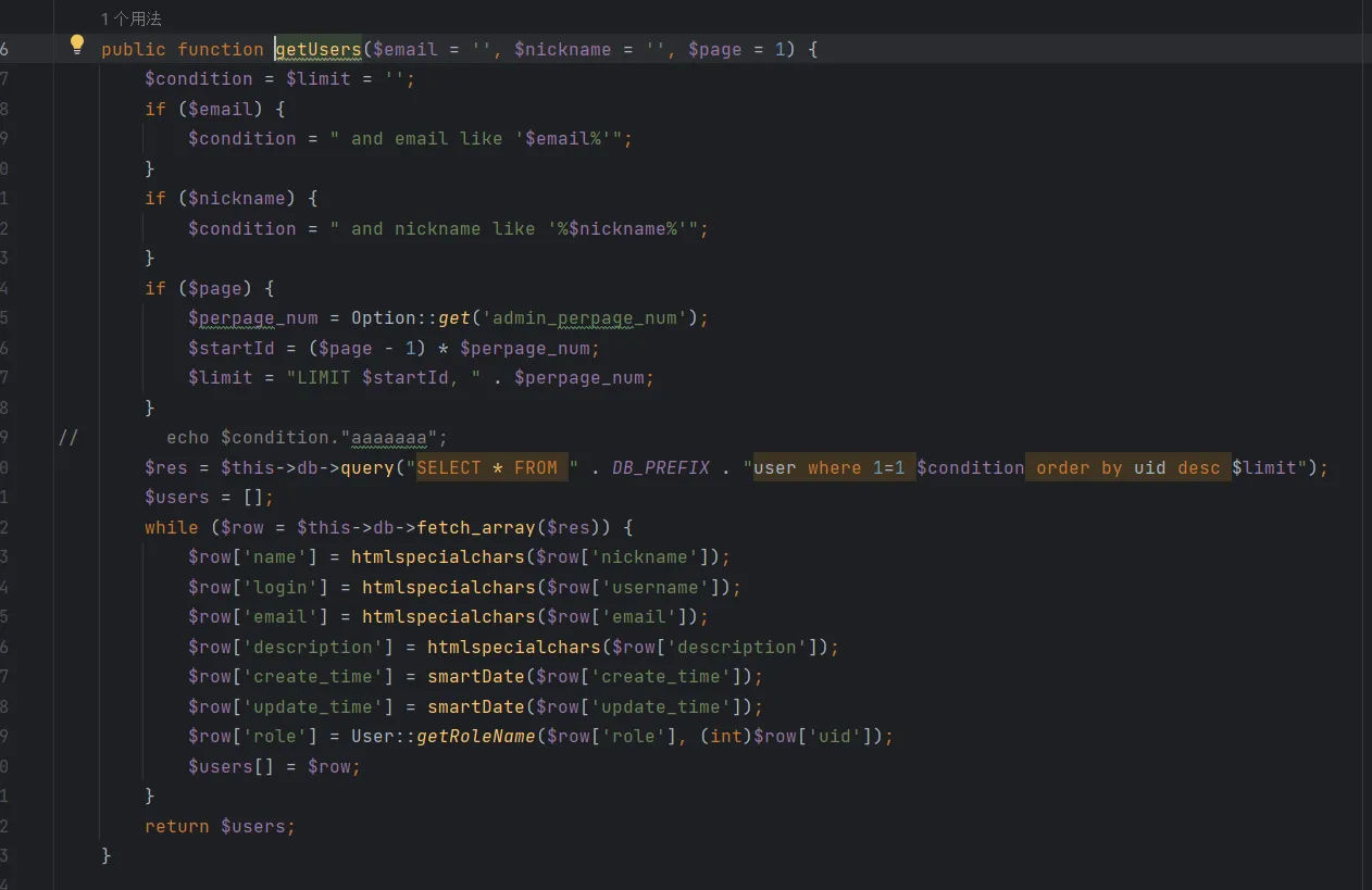1 | $users = $User_Model->getUsers($email, $nickname, $page); |