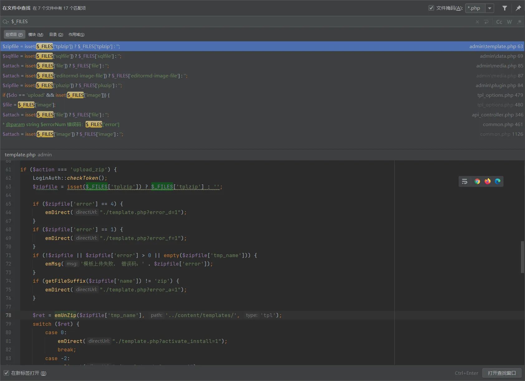 **emlog-插件文件上传** CNVD-2023-74535还是案例一的步骤,全局搜索 $_FILES ,然后定位到 /admin/plugin.php 位置