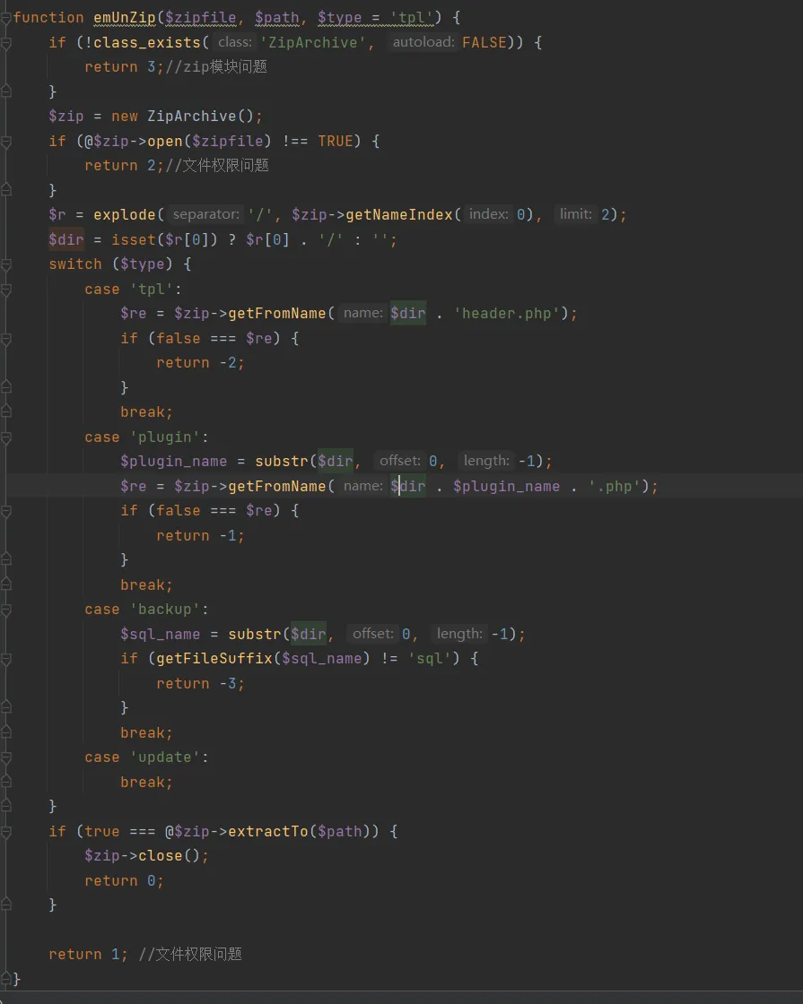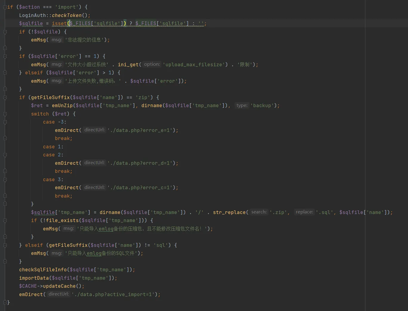 此处允许上传一个 zip 文件对 zip 文件的内容并没有做校验,并且给出了 zip 文件的解压位置,如果确认解压后可以执行那么此处就存在文件上传,由 CNVD 的内容可知此处确实存在文件上传,我们先不看这个继续往下分析一个不存在的深化我们的理解