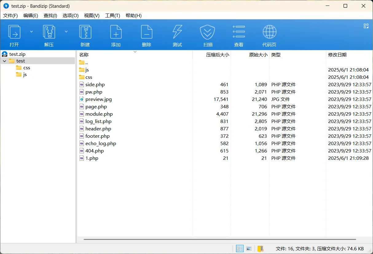 这里我们的值是 tpl ,只需要直接利用默认模板制作 zip 文件就可以了,其实也就是直接将上传的 zip 文件解压到了 ../content/templates/ 路径,我们要继续检查文件是否可以访问和被执行成功