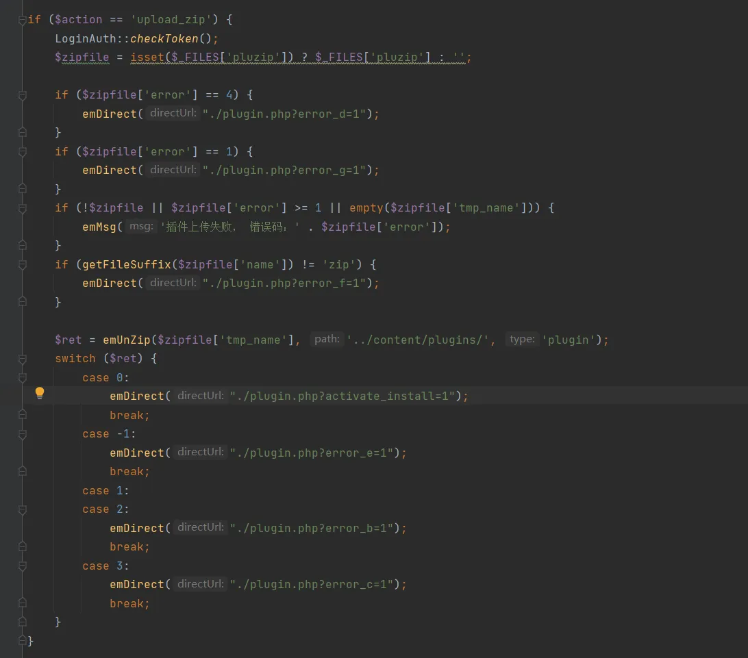 这里同样是上传 zip 然后解压,此处也只是检测了 zip 中是否存在 插件名.php 文件,同样直接搞一个网站自带的插件文件夹然后写个马子就行了,这里就不过多赘述了